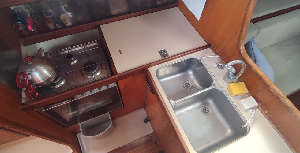 There is a lot of room to mount radar, VHF radio, chart plotter and other electronics, and plenty of space for navigation tools: pencils, rubbers, dividers and binoculars. It also has shelving for a CD player. The galley is well designed, with ample worktop space, double stainless steel sinks a top-loading fridge and a gimballed, two-burner stove with an oven and a grill. There is plenty of cupboard storage space.
