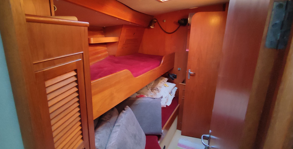 Moody 471Custom has a sensible layout. She has a fore toilet, washbasin, shower, storage lockers, doors to the forepeak, and both forward cabins. Forward Guest Cabins (2) are one to port, and one to starboard, each with upper and lower berths at the ship's sides, hanging lockers, and cupboards.