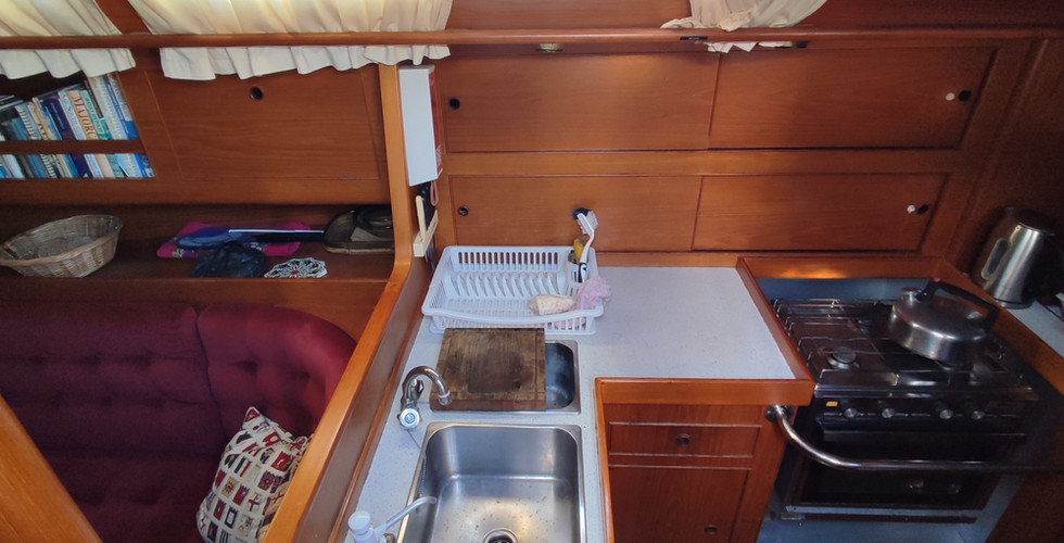 'U' shaped settee to starboard with smaller 'U' shaped settee opposite (seats 8 in total) and bookcases/lockers fitted to ship's sides in the saloon Dining table is centrally mounted with large foldout leaves. The galley is 'L' shaped to starboard, cooker, twin stainless steel sinks, hot and cold water, refrigerator, aft of the galley is a hanging locker/oilskin locker. The chart table is located at the port side of the saloon. The aft toilet split into two areas with the shower compartment and an oilskin locker forward and marine WC and basin aft. There are doors to the chart table and aft cabin. There is a central double berth, settee and wardrobe to starboard, and dressing table, in the aft cabin. Moody 471 Custom had a built-in transom bathing platform and teak decks (replaced in 2005).