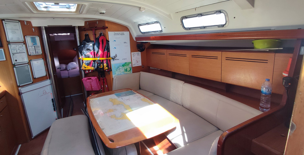 Descending from the cockpit, you enter a bright and spacious salon, characteristic of the Cyclades series. The open layout, light wood finishes, and large windows create a welcoming atmosphere, ideal for family cruising or charter operations. Polina has a charter history, reflecting consistent use and high maintenance standards over the years.