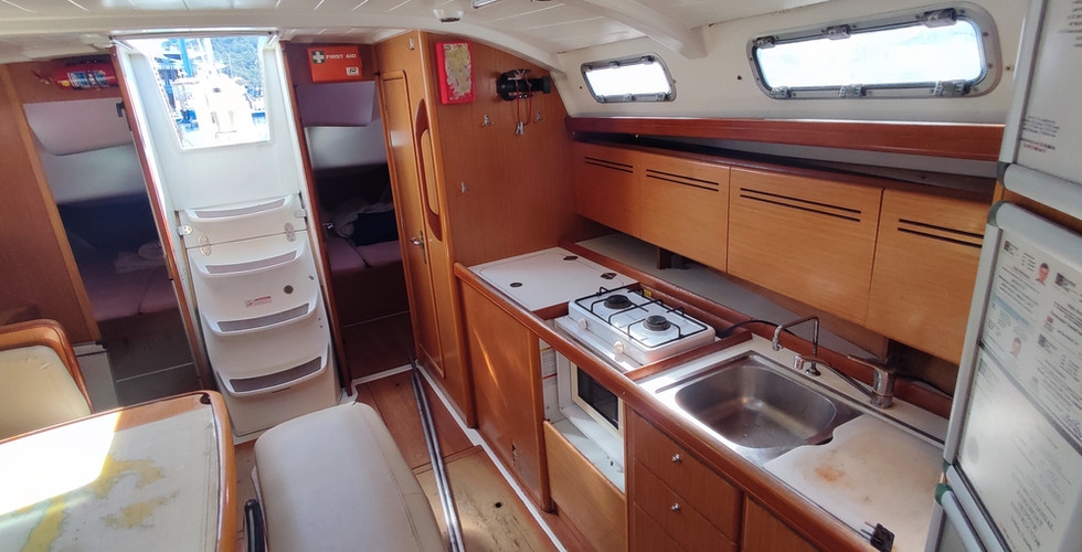 On the starboard side, an L-shaped seating area surrounds a large central table, perfect for dining or social gatherings. On the port side, an additional seating area is conveniently located next to the navigation station, making longer passages practical and comfortable. The galley, on the starboard side, is well-equipped and optimized for use at sea. It includes a stove with oven, double stainless-steel sink, ample countertop space, microwave, and plentiful storage, ensuring all provisions can be organized efficiently for extended trips. The navigation station is ergonomically designed with VHF, chartplotter, depth sounder, autopilot, and electrical panel all easily accessible, offering complete control of the vessel’s systems.
