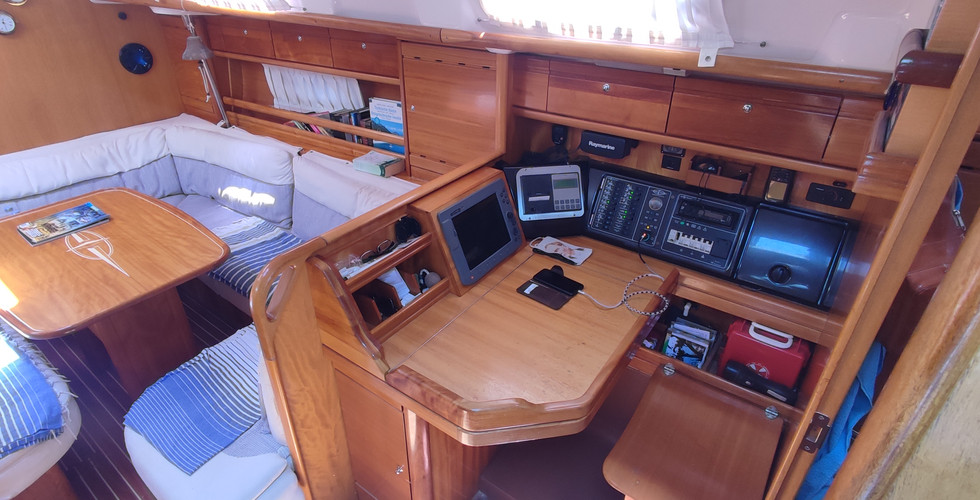 A separate navigation station is neatly tucked in the main cabin with the flexibility to easily add further navigation instruments. A Raymarine instrumentation package that includes their ST60 (speed/depth/and log), as well as the trusty old Windex, comes standard. VHF at the navigation station and above deck is also included.