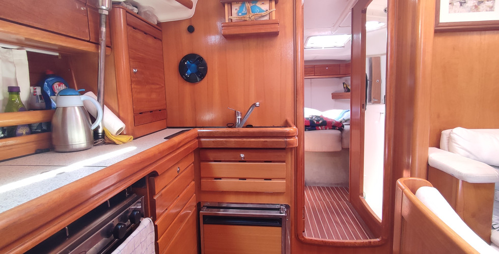 The large and functional galley includes two 12-Volt fridges, a double sink, and gimballed propane stove. And the salon could easily seat six, making a three-couple-cruise a breeze.