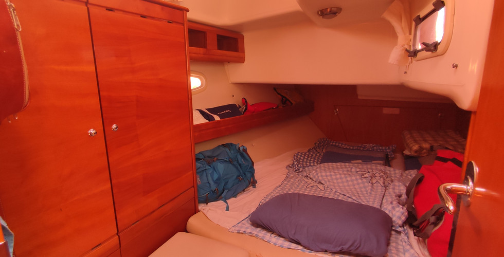 The below decks were bright and the solid wood and mahogany interior finish complemented each other nicely. Headroom was a pleasure - between 2 and 2.1 mt. Typical of what we call the new European standard were the well-fitting "crafted" doors and cabinets. There were also numerous storage lockers. Three cabins provide ample berths and the boat features two large well-appointed heads, the aft one containing a shower.
