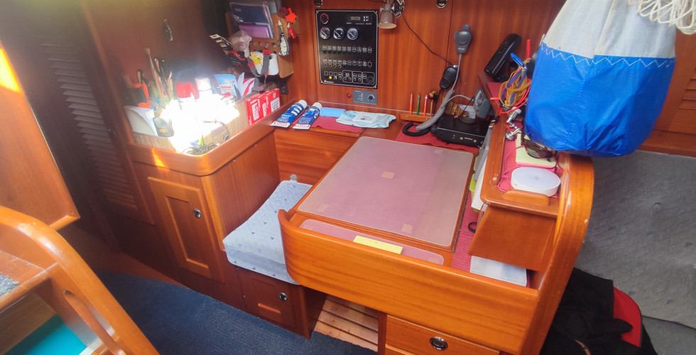 The interior layout is exceptionally well designed, providing excellent comfort and unobstructed movement throughout the boat. The strong mast support is integrated with the main bulkhead, not through the saloon table or sofa. The yacht also features a large forward-facing chart table with comfortable seating.